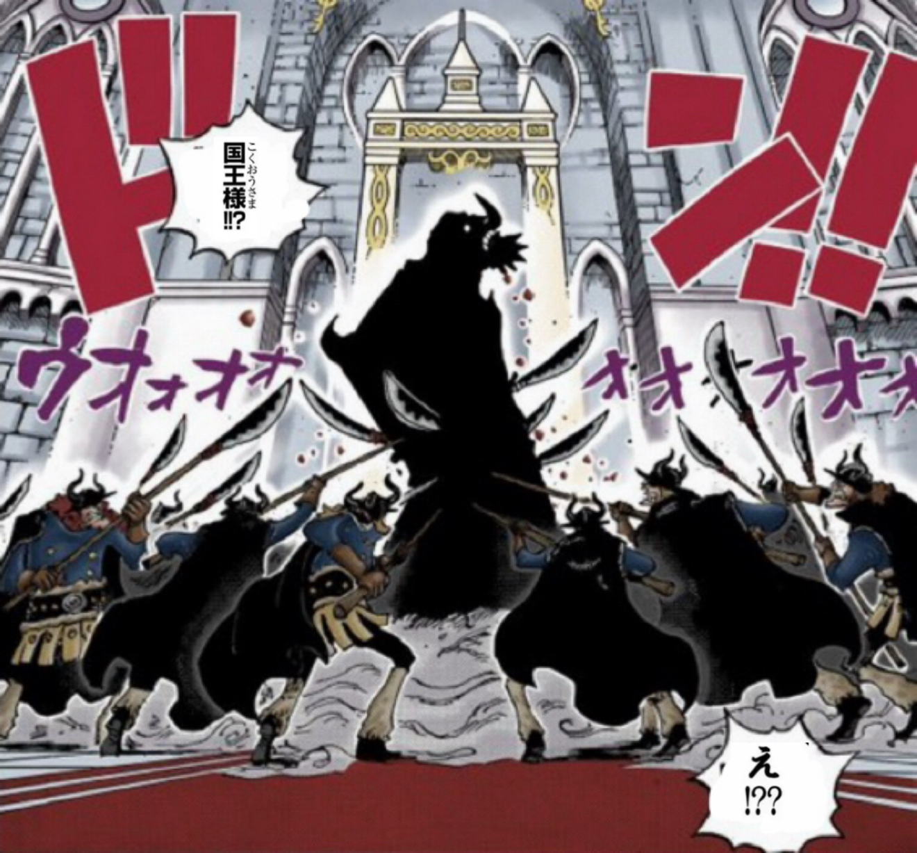 | 『国を挙げて戦士の軍団を組織せよ』イムの命令で元々世界政府に加盟させる気はなくエルバフの戦士達を奴隷にしようとしていた事に気付いた。 |