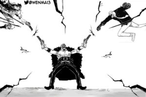 まずはここで運命を変えた。奴隷達を救う為にあれほど躊躇していた麻酔銃を撃つ事が出来た。くまはもちろんだが無防備な奴隷達がここでライフルの餌食になっていたかもしれない。革命軍の始祖は実はゴッドバレーでバッティングしていた様だ。(同じ場面を別軸、別視点でトレースして真相が明らかになるというパターンもエッグヘッド編からお馴染みとなっている。)