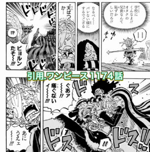 セイウチの学校から誘拐された子供10人の中に新巨兵海賊団航海士ロードの弟がいる事が判明した。(ビョルンは行進の最後尾を歩いていた。)